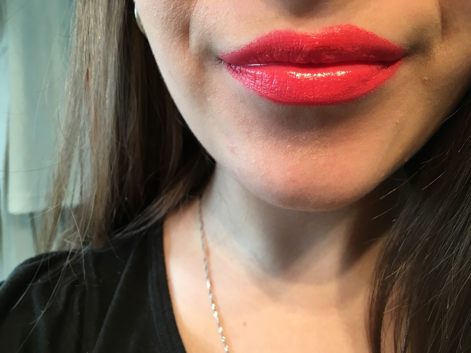 Vykreslení rtů s rtěnkou také nešlo jako po másle, ale po ruce jsem nikde konturovací tužku neměla, tak jsme si musela pomoct sama a rty vykreslit pouze s rtěnkou. Ale šlo to, i když špatně a zase jsme si hezkého tvaru pomohla tyčinkou do uší. Pigmentace rtěnky je moc hezká a stačí pouze přes rty přejet jednou a máte moc hezkou sytou barvu.