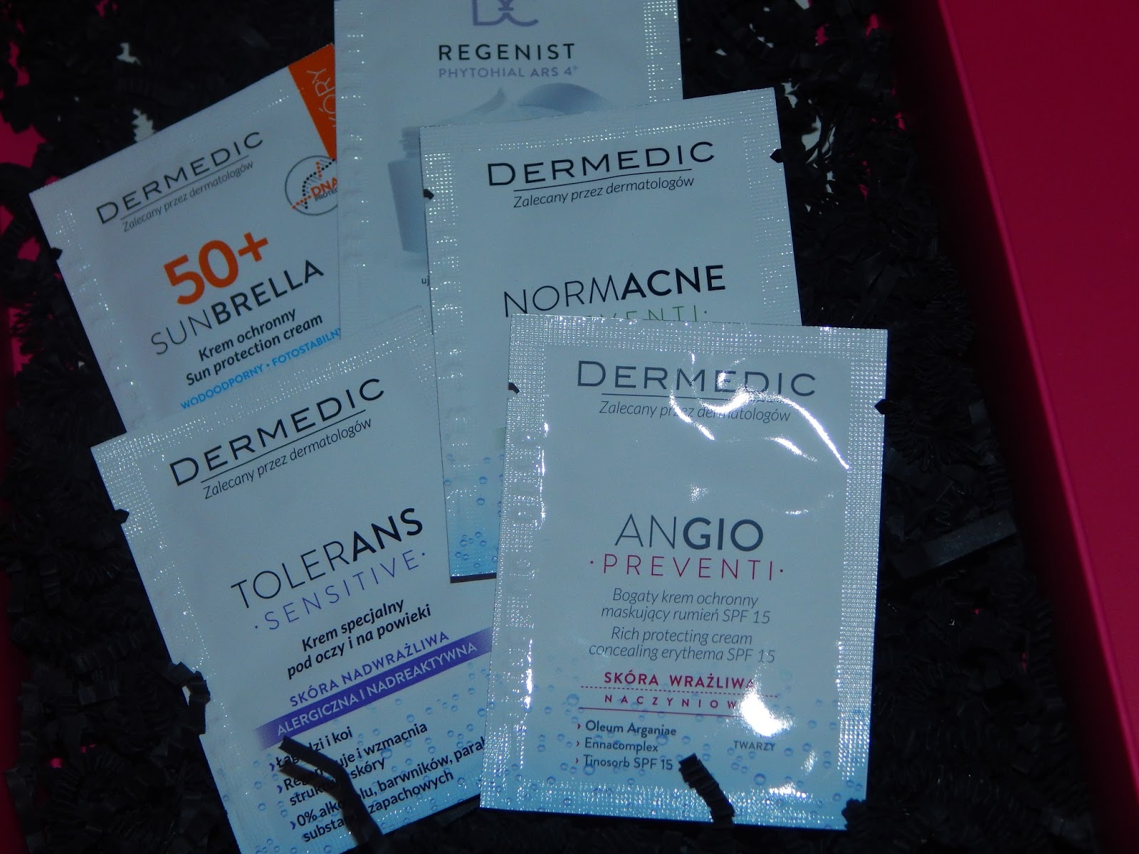 Dalšími poklady v balíčku byly vzorečky kosmetiky Dermedic. Od téhle značky jsme zkoušela před asi 2 lety korektor. První vzoreček je ochranný krém 50+ určen pro suchou až normální pokožku. Další vzoreček je zpevňující ochranný denní krém proti vráskám. Antibakteriální čistící gel pro smíšenou až mastnou pleť. Poté zklidňující oční krém vhodný pro citlivou, podrážděnou a popraskanou pleť. A jako poslední tu máme intenzivní krycí pleťový krém pro citlivou a zarudlou pleť.