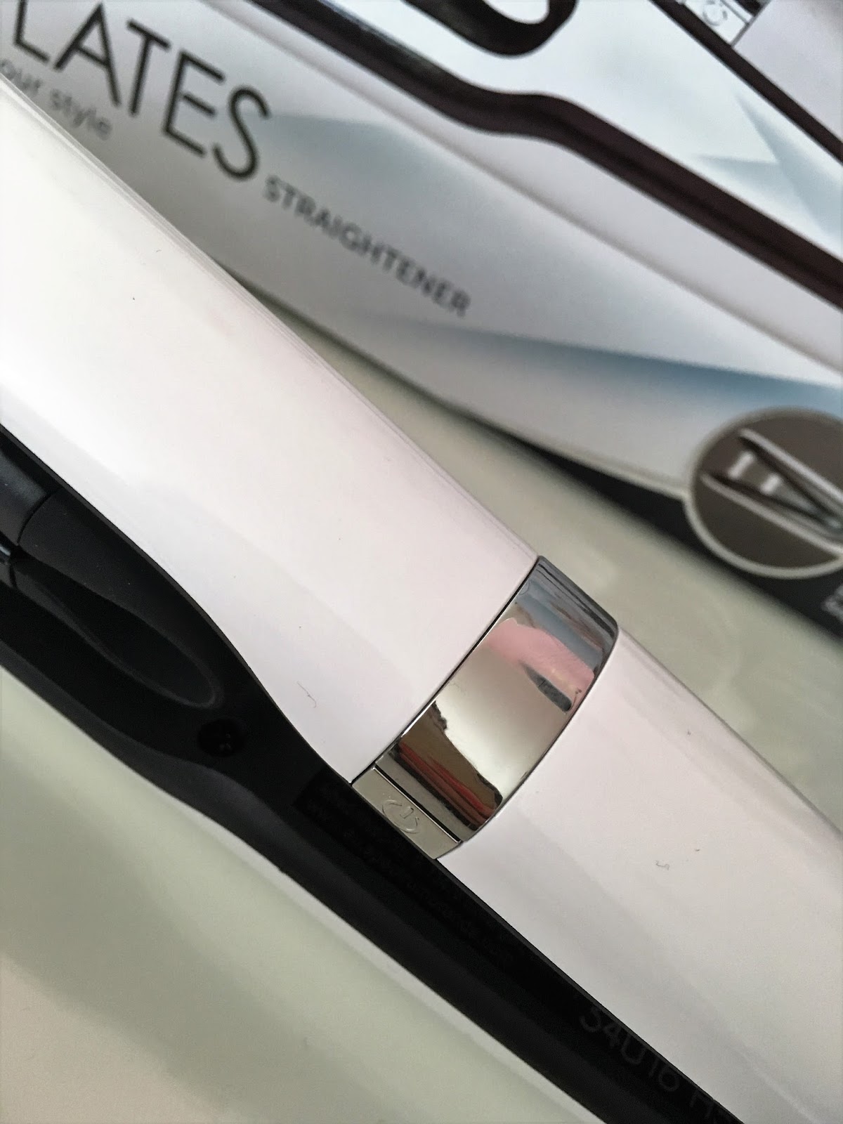 Žehlička byla zabalena v klasické papírové krabici a vložena ještě v plastové krabici, která měla přesně vytvarovaný tvar žehličky. Hned na první pohled se mi design žehličky velice zalíbil. Čistě bílý, nepřeplácaný, ale zároveň zajímavý a luxusní design! Přesně takhle si představuji žehličku na vlasy. Designový prvek na celé žehličce je pouze jeden a to stříbrné tlačítko, kterým se vypíná, zapíná a volí stupně teploty.